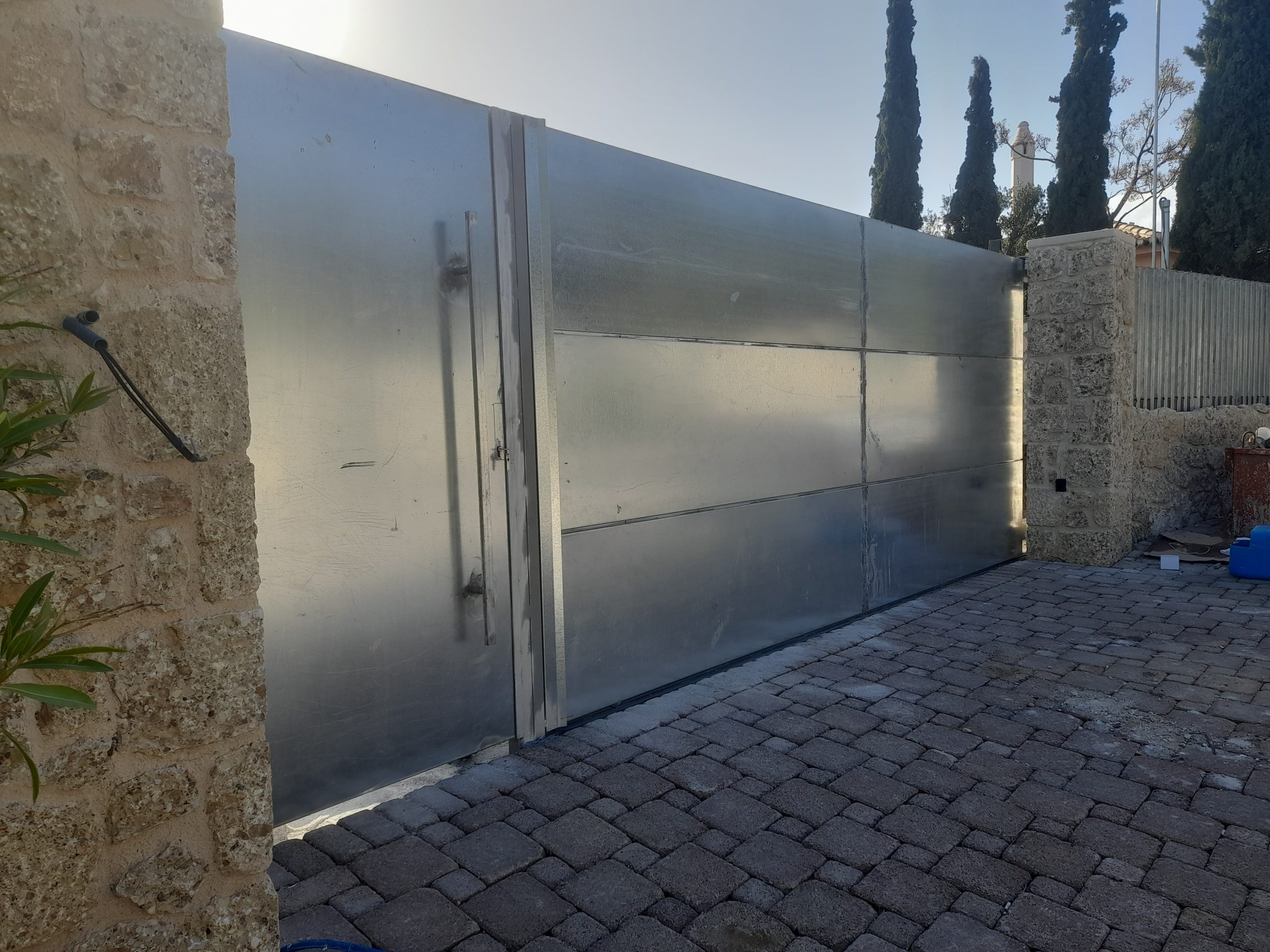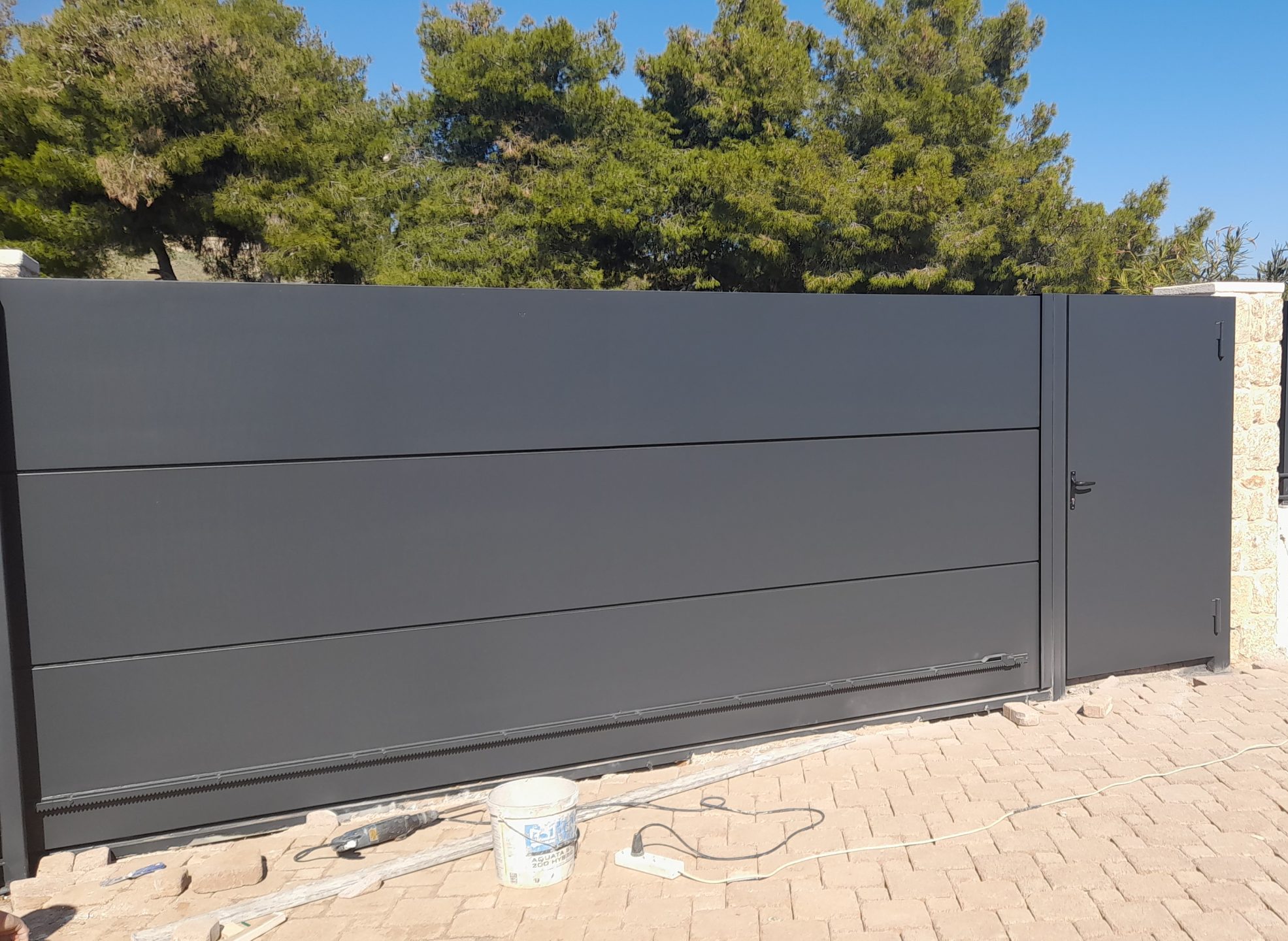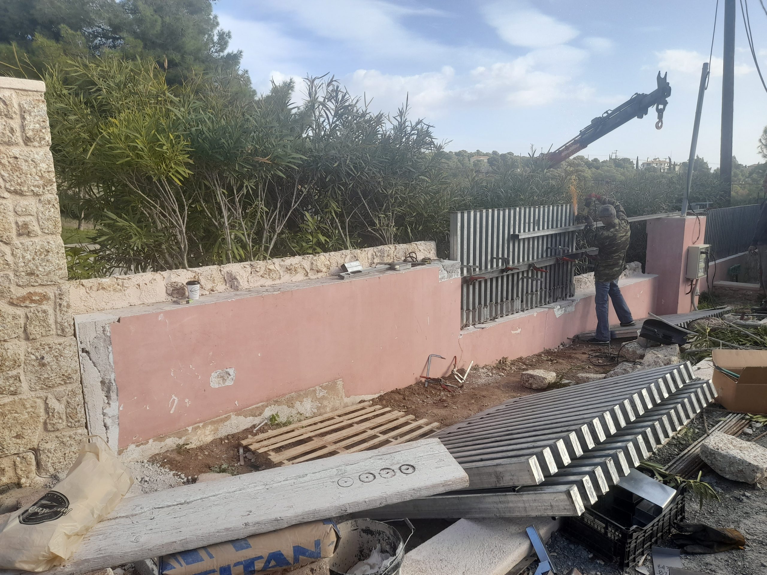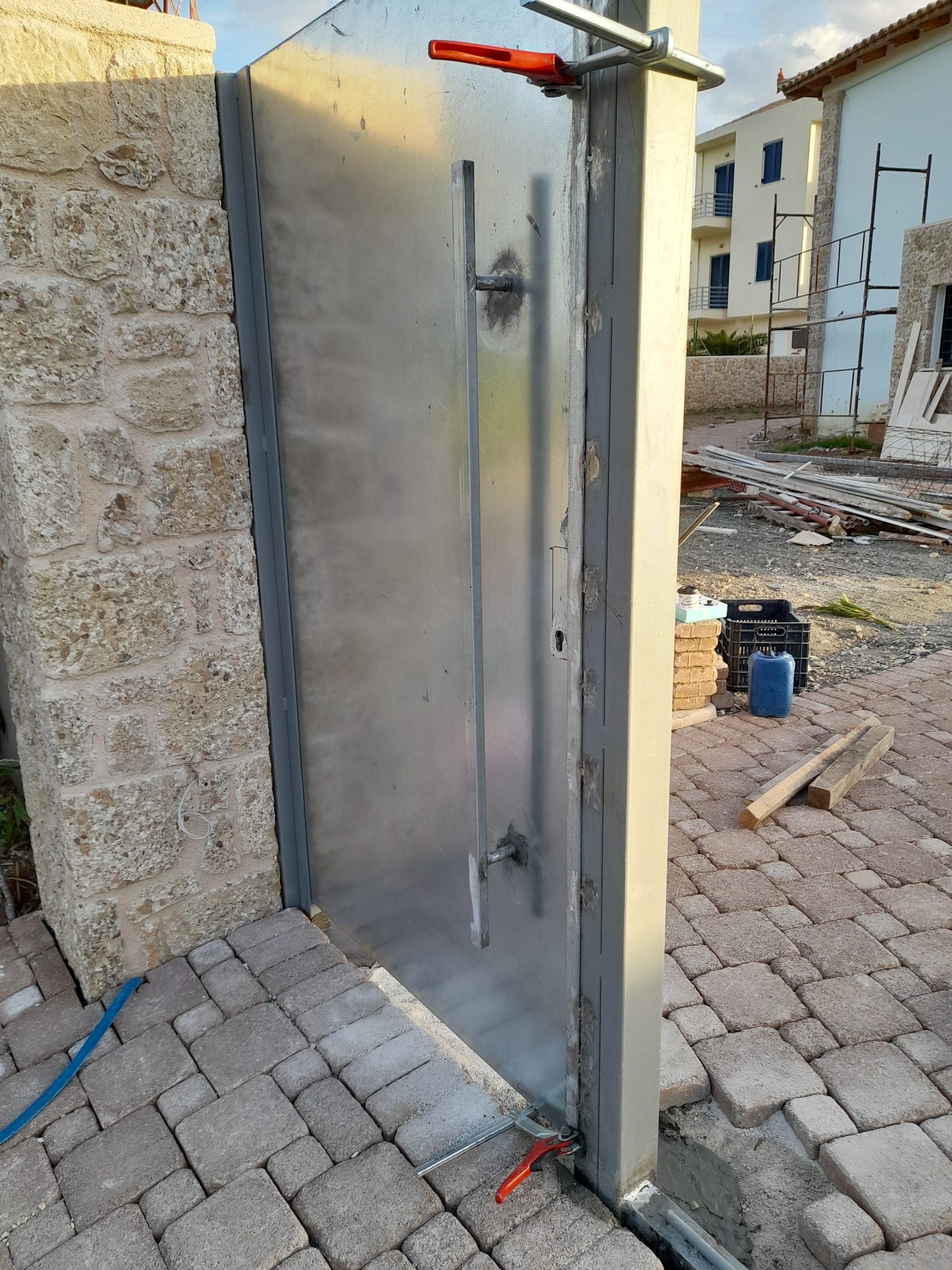 Το άνοιγμα της εισόδου καλύφθηκε με πόρτα για τους πεζούς σε διάσταση πλάτους περίπου 1 μέτρο, στερεώθηκε κολώνα από βαρέως τύπου σιδηροδοκό και εν συνεχεία τοποθετήσαμε τη συρόμενη γκαραζόπορτα σε διάσταση περίπου 4 μέτρα. Το ύψος των πορτών έγινε στα 2 μέτρα.