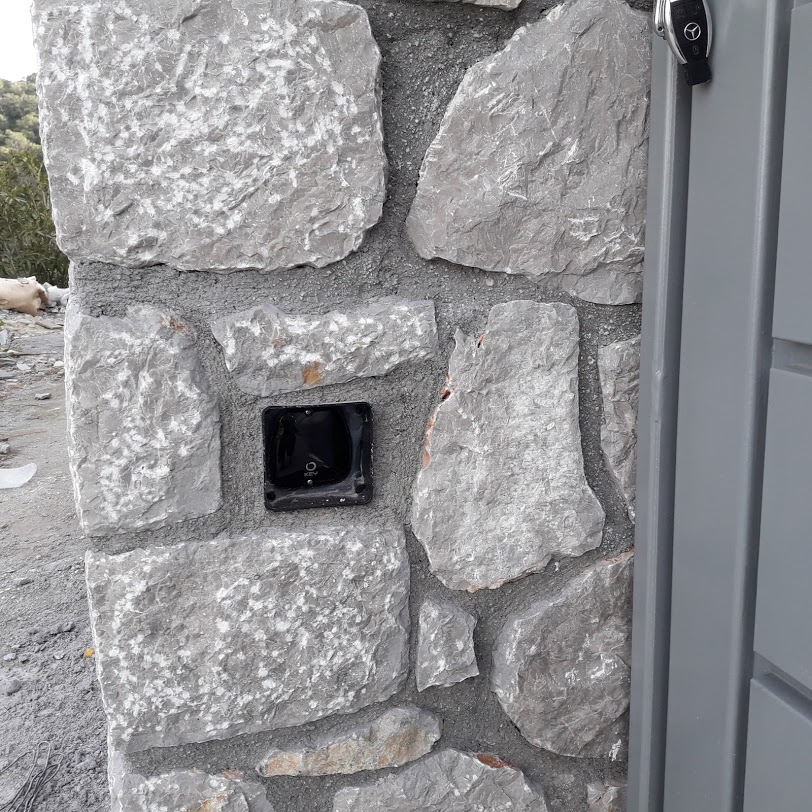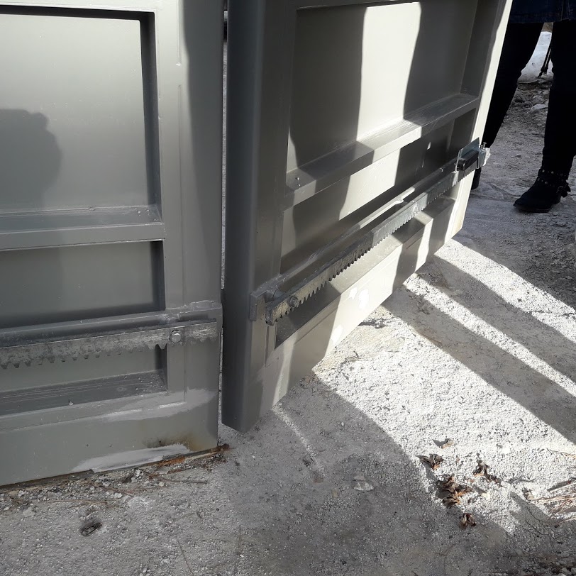 Δηλαδή, στη συγκεκριμένη πόρτα δεν τοποθετήθηκαν δύο απλά μικρά ραουλάκια τεφλόν για τη στήριξή της όπως συνήθως βλέπουμε στις κοινές συρόμενες πόρτες οικονομικής κατασκευής. Παρ,όλο που υπάρχει ο πέτρινος τοίχος σε μορφή Π μέσα στον οποίο σύρεται η πόρτα, εμείς εφοδιάσαμε την πόρτα με ράουλα τεφλόν, τοποθετημένα με τέτοιο τρόπο ώστε όσο και να <κακοποιηθεί> η πόρτα από πεζό ή όχημα να μην φύγει από τη θέση της.