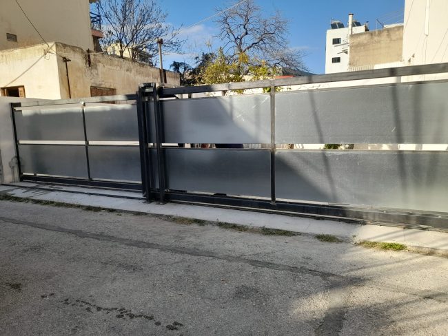 Τοποθετήσαμε κρεμαστή συρόμενη γκαραζόπορτα τύπου < Hanging gate >. Η πόρτα κατασκευάστηκε με πλαίσιο από κοιλοδοκό σιδήρου (δείτε κοιλοδοκός) πάχους 3 χιλιοστών ενώ η επένδυση του φύλλου έγινε από γαλβανισμένες λαμαρίνες τύπου πυραμίδα-ταψί με περιμετρικό γύρισμα (δείτε λαμαρίνα). Οι ιδιαιτερότητες του ανοίγματος είναι αρκετές, όπως κατηφορική ράμπα, ιδιαίτερα χαμηλό ύψος εισόδου γκαράζ, ανύπαρκτος πλαϊνός εσωτερικός…